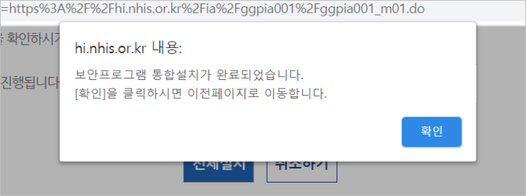 ④ 건강보험 관련해서는 개인정보이므로 보안프로그램을 설치하라는 메세지가 뜹니다. [통합설치프로그램]을 통해 컴퓨터에 깔아주시면 됩니다.