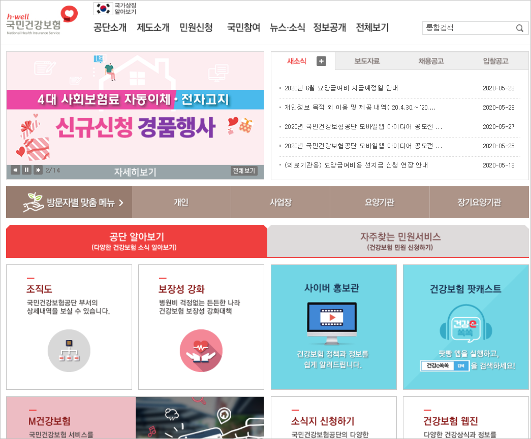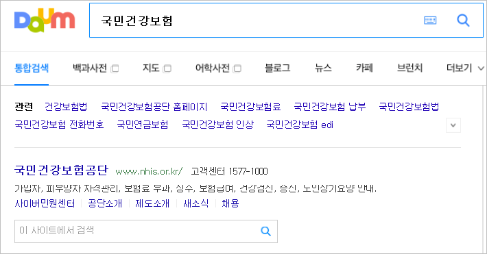 ① 국민건강보험 홈페이지에 들어갑니다. 위 링크를 선택하거나 '다음(DAUM)'포털에서 [국민건강보험]을 검색함 됩니다.