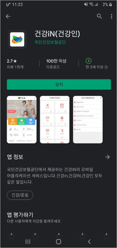플레이스토어에서 [건강IN]이라는 어플을 검색하여 설치합니다. 이 어플은 핸드폰에 설치되어 있는 공인인증서를 통해 로그인하면 바로 건강검진 대상자 확인을 할 수 있습니다.