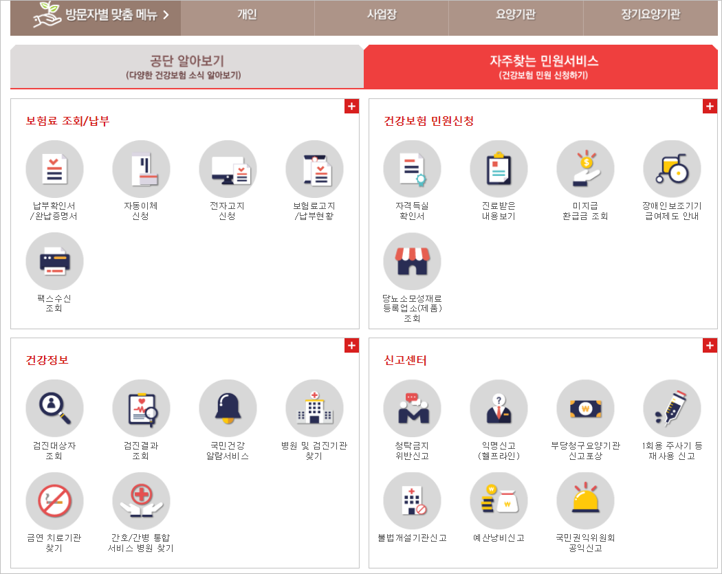 ② 국민건강보험 홈페이지의 우측 하단에 보면 [자주찾는 민원서비스] 항목이 보이실 겁니다. 이를 선택합니다.