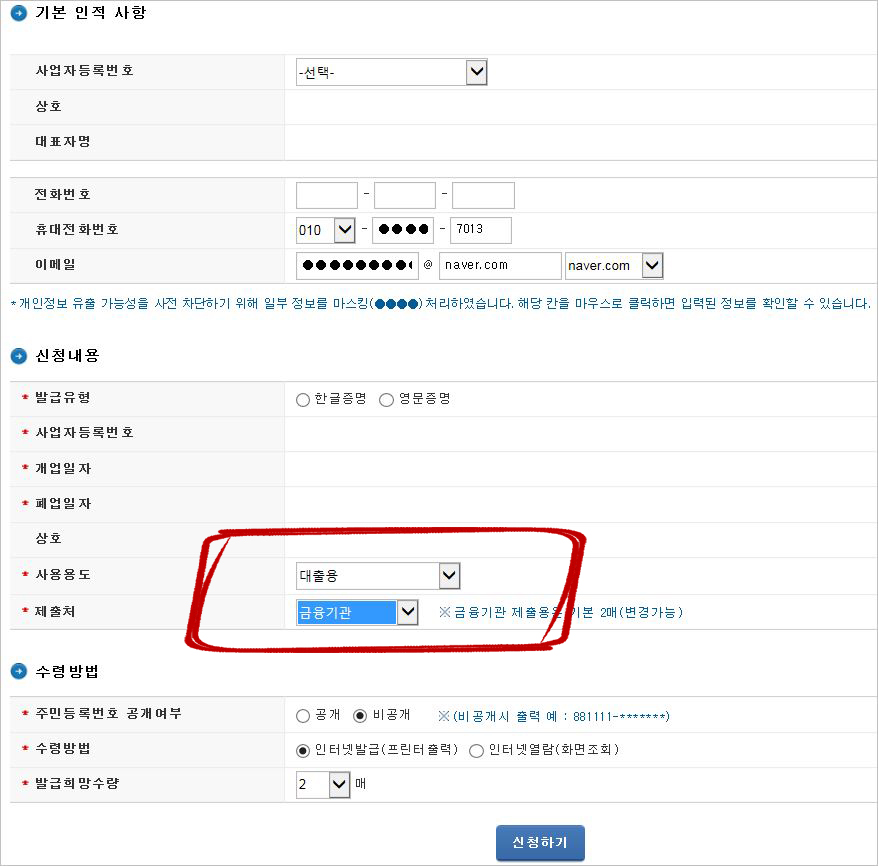 ⑤ 공인인증서 로그인까지 완료되면 이제 폐업사실증명원 발급방법 마지막 단계만 남았습니다. 사용용도를 '대출용', 제출처를 '금융기관으로 선택하시고 나머지 내용들을 정확히 입력해주시면 됩니다.