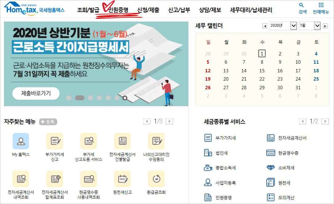 ② 홈텍스 홈페이지 최상단에 보면 [민원증명]이라는 항목이 있습니다. 이를 선택해주시면 됩니다.