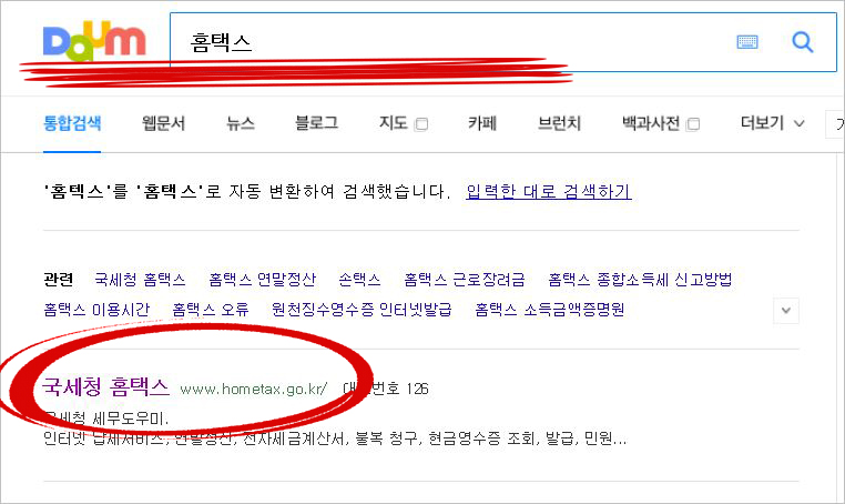 ① 다음(daum) 포털사이트에서 '홈텍스'를 검색, 가장 상단에 나오는 국세청 홈텍스 사이트로 들어갑니다.