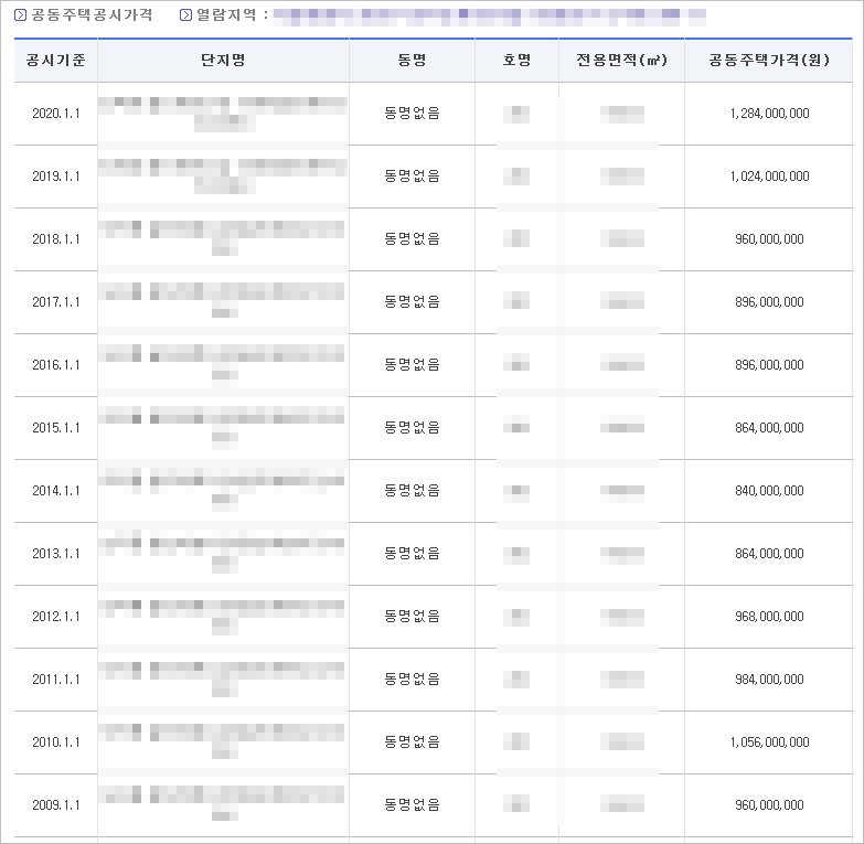 ⑥ 모든 입력이 끝나고 검색을 선택하면 이렇게 아파트 공시지가조회가 됩니다. 나와 동일한 면적 및 층수에 따라 금액이 나오기 때문에 비교하기에도 매우 좋습니다.