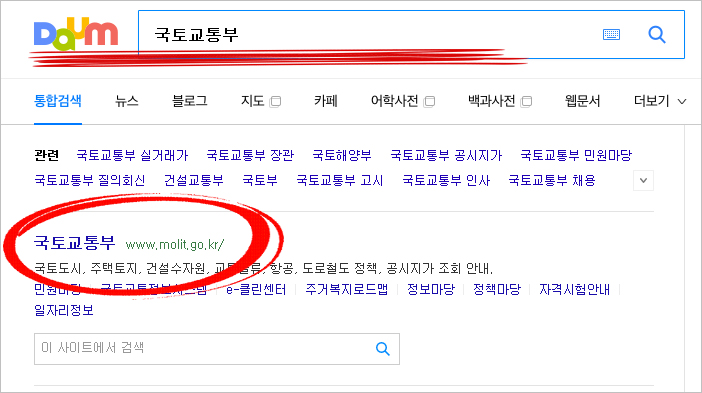 ① 다음(daum) 포털 검색창에 '국토교통부'라 검색해서 나오는 홈페이지에 들어갑니다.